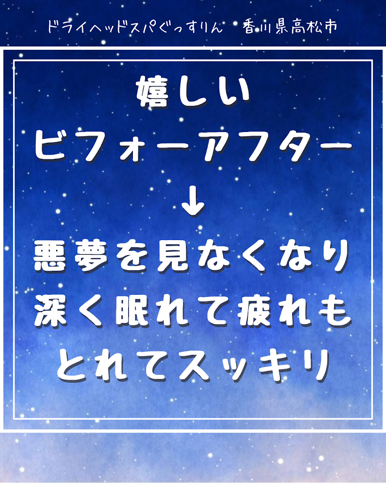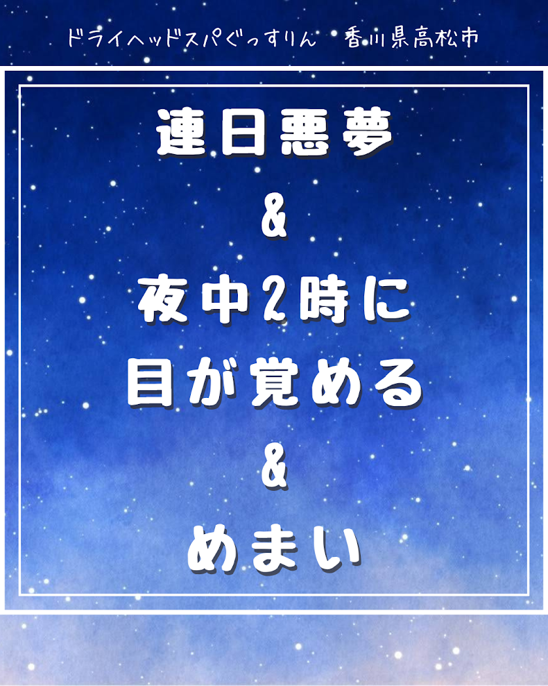 そんな方は、ぜひ一度、香川県高松市のドライヘッドスパ「ぐっすりん」へご相談ください。あなたの"ぐっすり眠れる夜"を、しっかりとサポートいたします。