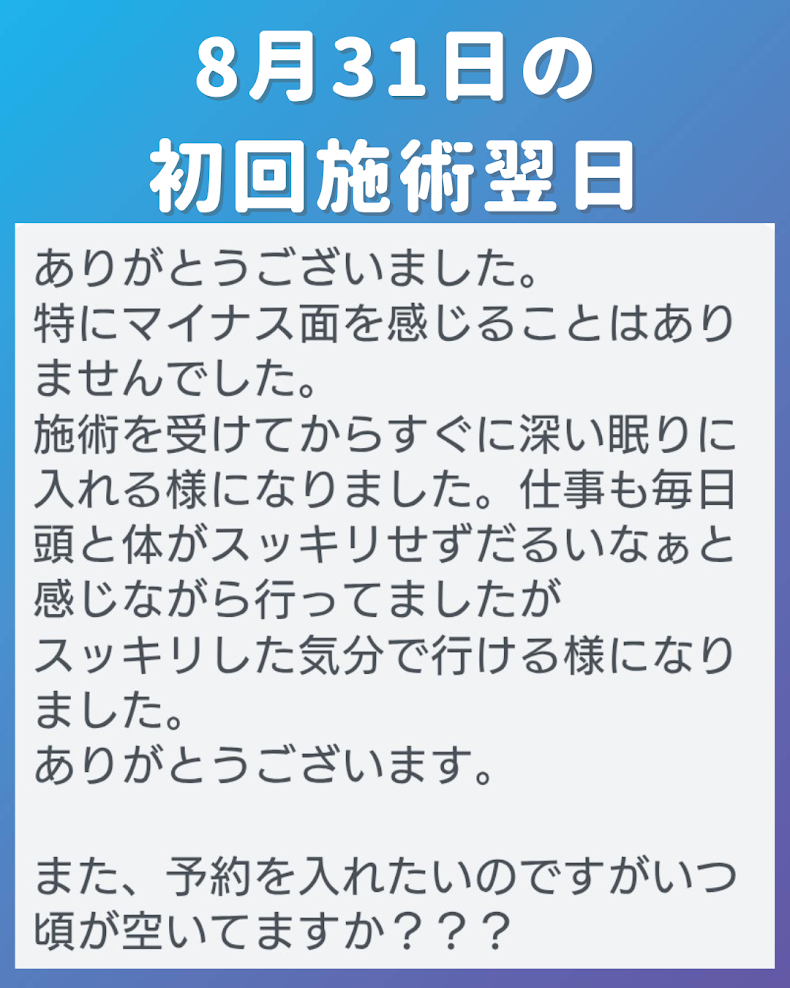 初回施術(2025年8月31日)の翌朝、お客様から「施術を受けてから深い眠りに入れるようになった」「毎日頭と体がスッキリせずだるいなあと感じながら仕事に行っていたが、施術後はスッキリした気分で仕事に行けるようになった」との声をいただきました。