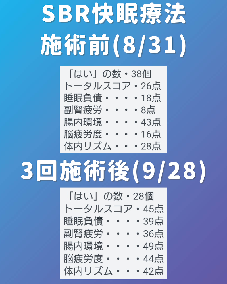 約1ヶ月間、SBR快眠療法の継続施術(全4回)を受けられた結果、お客様は「悪夢を見なくなり、途中で目覚めず深く眠れるようになった」とお話しくださり、一度フォローを中止してご自身のタイミングで施術を受けに来てもらうことになりました。