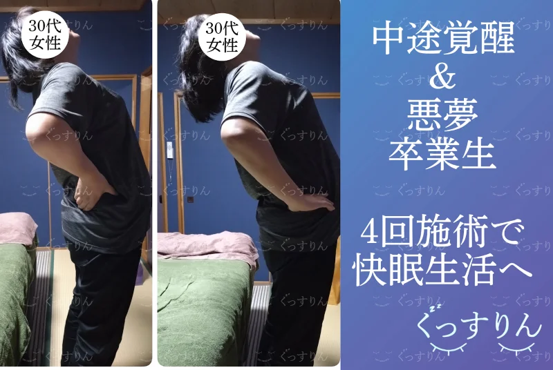 最初は「夜中の2時に目が覚めてから眠れず、悪夢をみてうなされる」と話されていましたが、わずか4回の施術で眠りの質が劇的に変化。